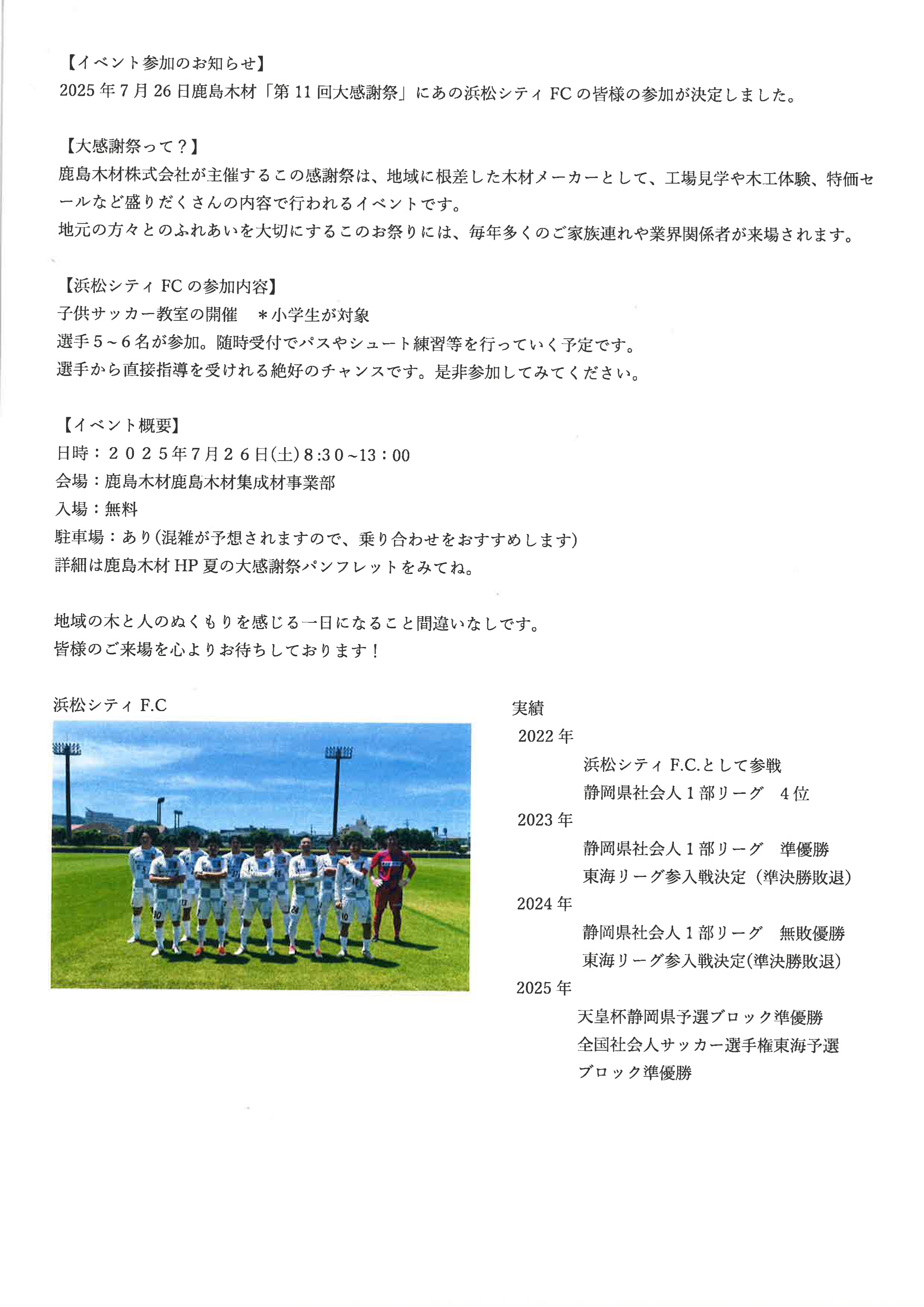 2025年7月26日鹿島木材「第11回大感謝祭」にあの浜松シティFCの皆様の